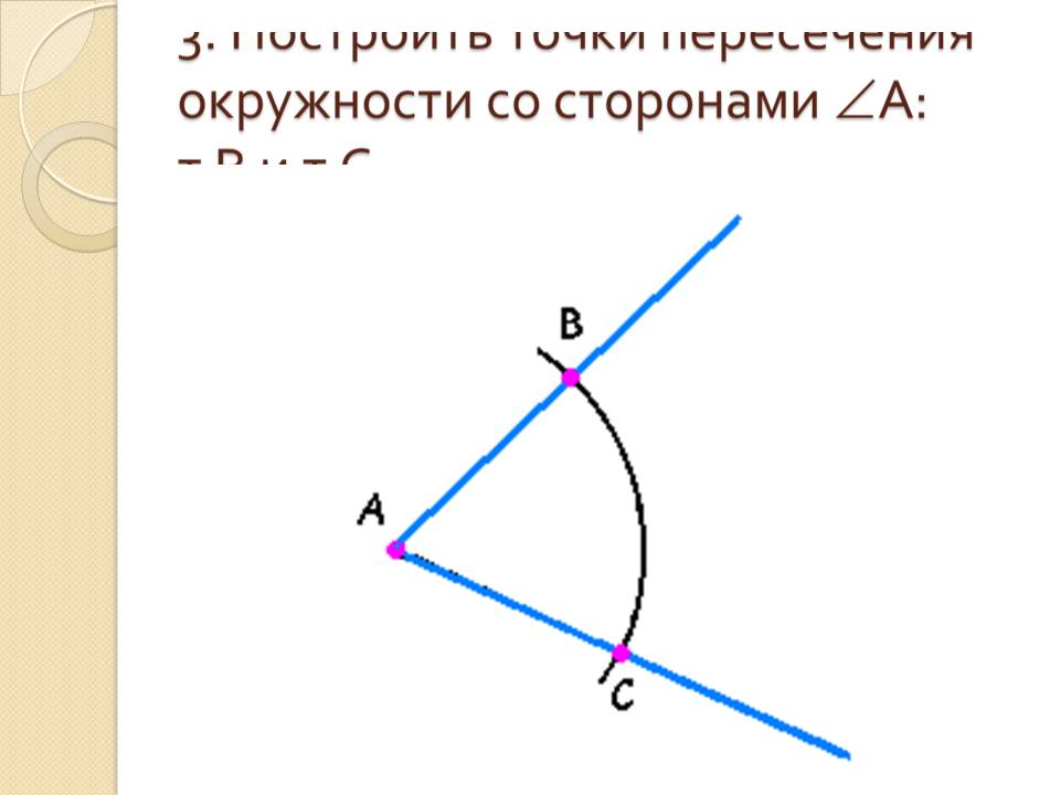 << 2. Построить окружность произвольного радиуса с центром в вершине | 4. Построить две окружности равного радиуса с центрами в точках В и С >> |